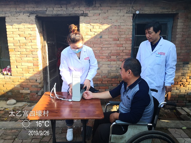 2019年9月25日我院安排外联办、综合内科联合长安区太乙街道卫生院共5名医护人员赴长安区太乙镇四壕村走访、义诊了5名贫困群众,并为他们提供了健康咨询、血压测量、血糖检测等健康服务。