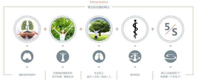为提升医院管理及形象,我院按照现代医院运营管理理念,进行了医院LOGO的品牌形象设计,对国内外卫生行业品牌徽标进行了分析,通过设计语言让医院环境拥有更多人性化的温暖和关爱,以期文化理念指引视觉,通过视觉反映医院文化理念,使社会公众产生认同感,达到识别医院的目的,初步设计的徽标经过医疗、医技、行政保障部门四个层次的会议讨论,听取了讨论意见并进行了修改,后经专题会议研究确定了医院的徽标,医院LOGO徽标设计涵盖“五大文化元素”清新自然的肺、对患者的情感关怀、生命至上、医学蛇杖、第5人民医院的“S”陕西的第一个字母“S”。