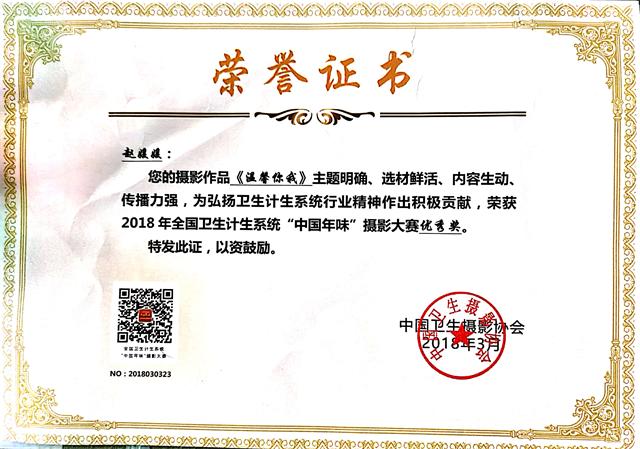 2018年3月我院内二科职工赵媛媛的作品《温馨你我》荣获2018年全国卫生计生系统“中国年味”摄影大赛优秀奖。本次大赛旨在用影像记录两节期间(元旦,春节),医护人员爱岗敬业,和谐医患,记录中华优秀传统文化,彰显人文关怀。