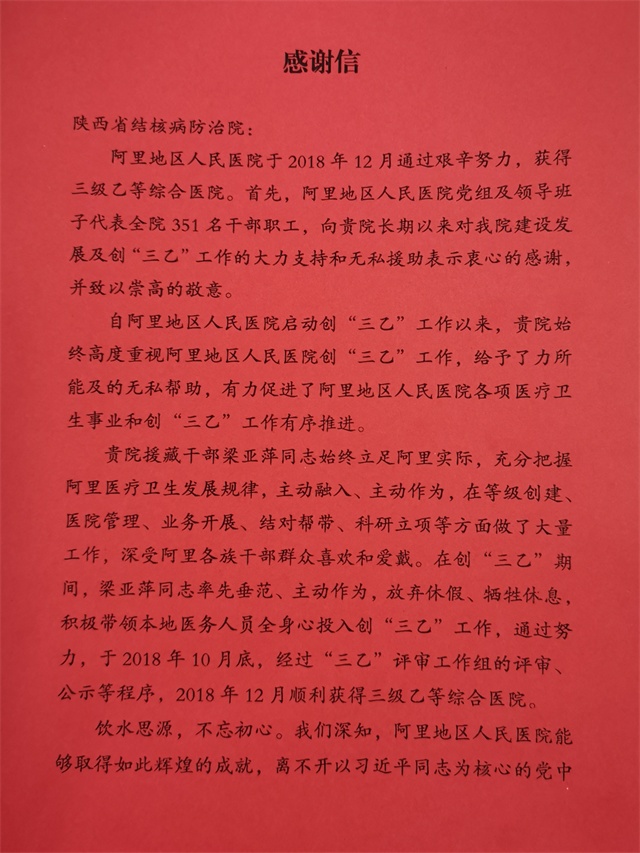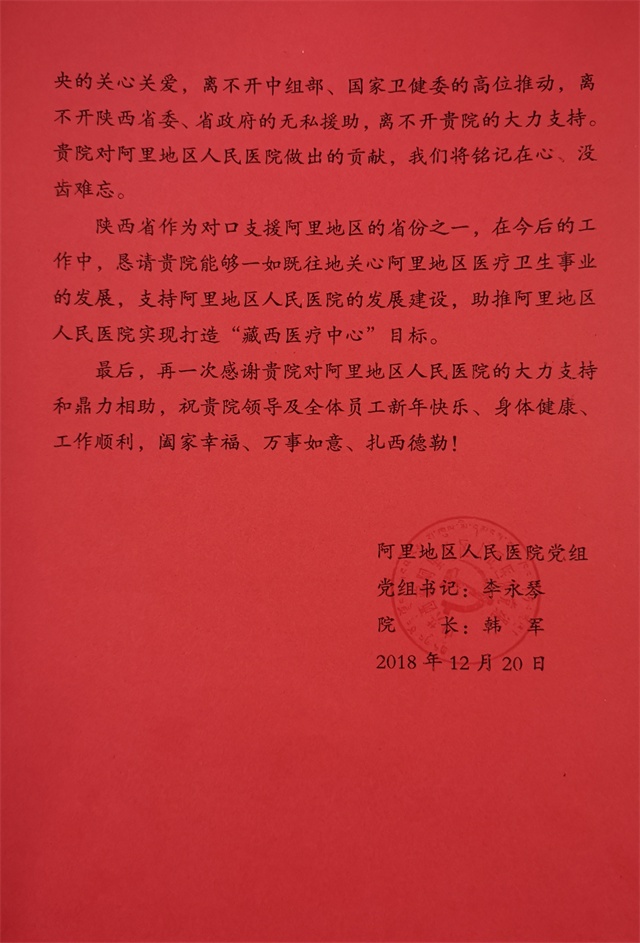 2019年1月2日,我院收到来自西藏阿里地区人民医院发来的感谢信。信中提及该院已于2018年12月顺利通过了三级乙等综合医院评审。特向我院以及我院援藏干部梁亚萍同志在创“三乙”工作中的支持与援助表示诚挚的感谢。