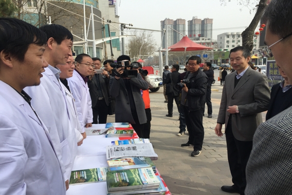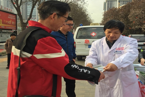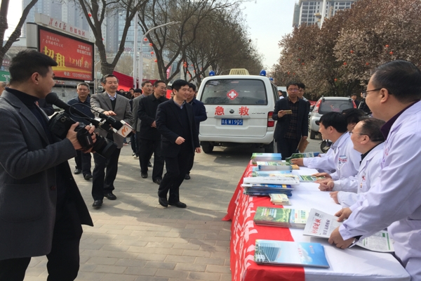 医保办主任黄治俊给市民赠送结核病宣传资料 解答医保政策 省中医药管理局局长马光辉、陕西省卫生计生委疾控处副处长彭飞、陕西省结防所所长张天华等领导亲临义诊现场慰问义诊专家及工作人员。