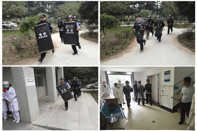 为贯彻落实党的十九大期间做好医院安全维稳工作会议精神,确保双节期间医院安全稳定,我院保卫科联合驻地公安机关在9月30日对突发出现的紧急安防事件进行了模拟演练。