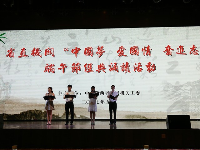 根据中共陕西省直属机关工委《关于举办“中国梦、爱国情、奋进志”端午节经典诵读活动的通知》(陕直工发〔2017〕23号)文件精神,5月22日,我院组织田兴文等4名医务人员在曲江惠宾苑宾馆参加了“中国梦、爱国情、奋进志”经典诵读比赛活动。