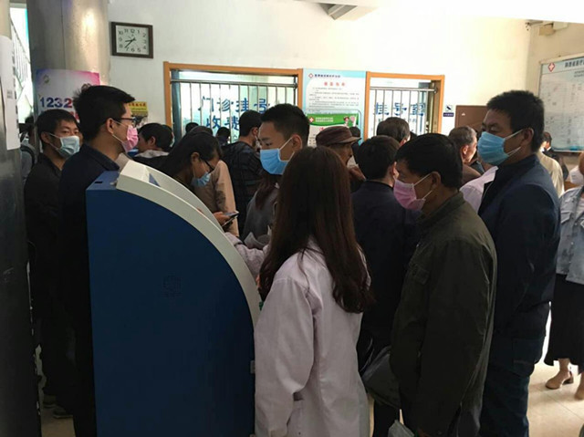7、4月26日早8点整,病人在检查科室刷居民健康卡。