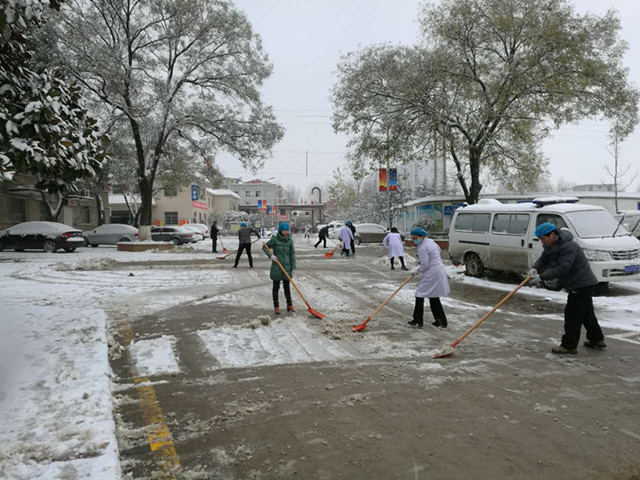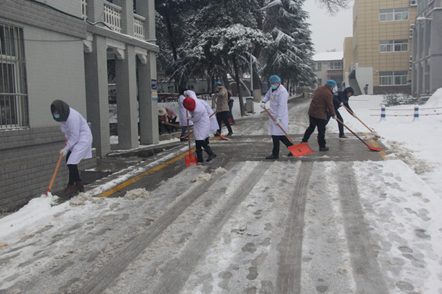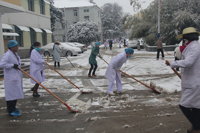 为保障患者、职工出行安全,方便患者就医,22日下午3点,党委书记甘昭平主持召开行政中层干部工作会议,就清扫院内积雪进行了详细的工作布置。会后,甘书记带领院办、党办、总务等行政后勤部门的全体干部职工,迎着风雪,带上工具,清理院内积雪。职工们相互配合、团结协作,有的手拿铁锹,有的手拿扫把等清雪工具,忙碌扫雪的身影构成了一道靓丽风景线。经过近两个小时的共同努力,清扫出工作区的车行道、人行道及工作区主干道通往院外的道路,保障了院内道路的畅通,排除因为大雪而带来的不便,为前来就诊的患者提供了一个安全的就医环境。