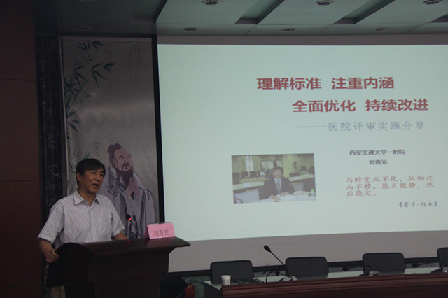 刘青光教授是全国等级评审知名专家,是我省等级评审专家组组长,对等级评审工作有丰富的理论知识和实践经验。历时4小时,刘教授从评审历史介绍、本轮评审特点、评审实践经验和评审体会交流四个方面对等级评审工作做了详尽的介绍。着重强调了最新一轮等级评审的“三个改变”和“三个提高”,现场评审模式的改进及在评审过程中一定要体现“PDCA管理方法”。刘教授结合评审实践经验提出要将评审工作常态化,提高全院职工的主观能动性,“决策在高层、落实在中层、行动在基层”。本次讲座内容丰富,实用性强。