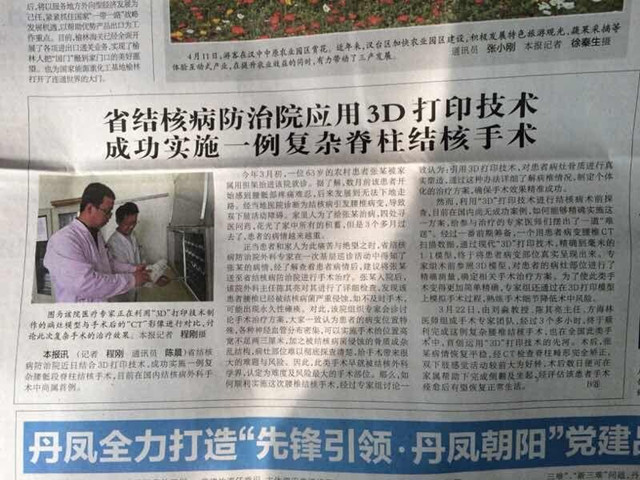 省结核病防治院近日结合3D打印技术,成功实施一例复杂腰骶段脊柱结核手术,目前在国内结核病外科手术中尚属首例。4月11日陕西日报在第3版对该手术进行了报道。