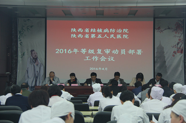 三级结核病专科医院复审申报动员大会上,仵倩红副院长传达了《陕西省医院等级评审(复审)工作方案(2015年)》重要精神,组织学习了《陕西省结核病防治院关于启动三级结核病专科医院复审工作的通知》(陕结院发【2015】51号);杨磊院长助理、刘尚武院长助理分别组织学习了《陕西省结核病防治院2016年三级结核病专科医院复审工作的安排》及《陕西省结核病防治院关于调整等级评审组织机构的通知》。