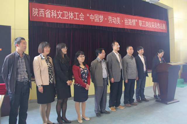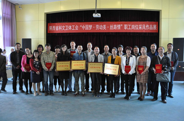 4月27日早,陕西省科文卫体工会的“中国梦·劳动美·丝路情”职工岗位采风作品展开幕式暨颁奖活动在我院西院多功能厅召开。院工会牵头准备好指示牌,护理礼仪人员组织签到发放会议资料,保卫人员及时梳导各单位参会车辆,相关部门共同配合积极办会。省总工会党组成员、纪检组组长席金峰;省科文卫体工会主席王喜潮、女职委主任吕晓宁;常委及我院在院领导与行政后勤部门职工、省科文卫体工会所辖直管单位工会17家工会主席、女职委主任、采风作品获奖作者,共约100余人参加了本次会议。我院党委书记、纪委书记甘昭平向与会人员致欢迎辞,省科文卫体工会主席王喜潮作了会议致开幕词,省科文卫体工会女职委主任吕晓宁宣读了“中国梦·劳动美·丝路情”科文卫体职工岗位采风优秀作品展表彰通报。向获奖作者、单位颁发了获奖证书与牌匾并现场进行了合影。省总工会纪检组组长席金峰宣布展览活动正式开始,大家对获奖作品共同进行了观赏。
