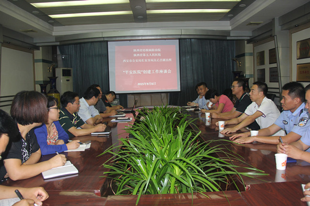 为全面贯彻落实《陕西省卫生计生委关于开展“平安医院”创建工作督导检查的通知》(陕卫医发【2015】189号)文件要求,进一步推动安全生产、安全发展、预防为主的工作核心,加强医院治安消防建设,积极推进平安医院创建工作,结合医院实际,9月6日下午,我院与西安市公安局长安分局太乙宫派出所召开了“平安医院”创建工作座谈会。太乙宫派出所毋指导员一行5人与我院领导班子及相关职能科室负责人进行了座谈。