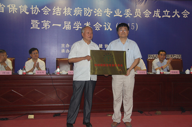会上首先由省保健协会副秘书长王岚宣读了协会批复文件并介绍了协会基本工作情况,对陕西省结核病防治院为大会的成立所做的工作和成绩给予了充分的肯定,并期待以后的工作再接再励。接着由陕西省结核病防治院刘锦程院长介绍了委员会的筹备情况,目前全球有20亿人感染结核菌,我国每年报告活动性肺结核病人约100万,是全球22个结核病高负担国家之一,我省结核病疫情近年上升势头虽得到有效遏制但形势依然严峻,其中每年新发肺结核患者约2万多例,加上肺外结核就更多了,全省结核病患者大约 20万之多。目前我省许多从事结核病防治的医务工作者,无专业的结核病防治知识,缺乏相应的结核病防治经验,结核病防治新模式工作需要专业技术人员具备专业的结核病防治能力,并能尽快进行学术交流,而我省无独立的结核病防治团体。为加强省内结核病防控领域的经验及前沿学术交流,提高我省结核病的防控能力,尽快全面推行结核病防治新模式,在此背景下由我院主发起向省保健协会申请,我院于2014年12月1日正式开展筹备工作,分别在4月20日、7月28日召开了筹备会,经过1年多的精心筹备、各方面积极协调努力,成立陕西省保健协会结核病防治专业委员会。这是我省第一家结核病防治专业学术机构,意在进一步增加结核病防治专业人员的交流和合作,促进结核病诊疗新技术、新方法在医疗机构中的应用,促进结核病防治工作高质量、可持续发展。然后由省保健协会秘书长吕永杰宣读了第一届委员会名单并现场进行了投票表决。之后新任主任委员刘锦程代表主委单位作表态讲话:本会将在保健协会的指导下,积极进取、开拓创新,通过组织各类学术会议、义诊、培训加强委员之间的交流和互动;积极发掘、扶持、培养和推荐结核病学术领域的新人;为本会委员提供一个良好的学术氛围和交流平台。最后由陕西省保健协会领耿庆义会长为结核病防治委员会颁发了协会铜牌,刘锦程院长代表结核病防治委员会接牌。