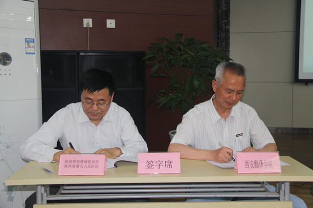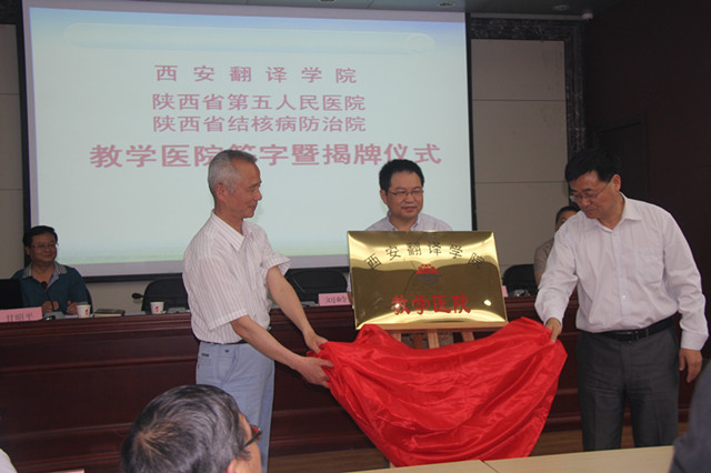 随后,刘锦程院长代表我院与西安翻译学院沈久福院长共同签署了《西安翻译学院与陕西省第五人民医院建立教学医院协议书》,并由省卫计委刘岭副主任和双方院长代表共同揭牌,正式确立了我院与西安翻译学院的合作关系。