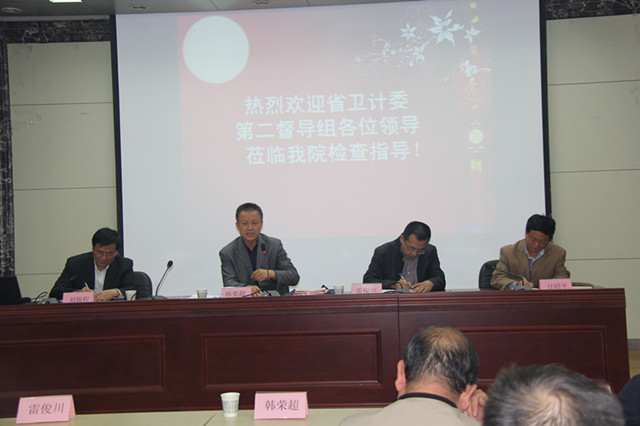 10月21日下午,省卫计委第二督导小组组长韩荣超副巡视员一行4人,对我院2014年度目标工作任务完成及群众路线教育实践活动整改方案落实情况进行督导检查。工作汇报会在学术厅召开,院班子成员、中层干部及副高以上职称人员参会,会议由党委书记甘昭平主持。