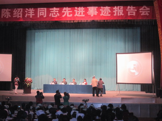 在事迹报告会上,与会人员听了陈绍洋的事迹,热泪盈眶,无不深受感动,都决心要向陈绍洋学习。