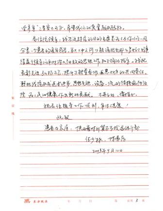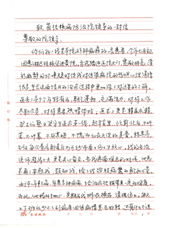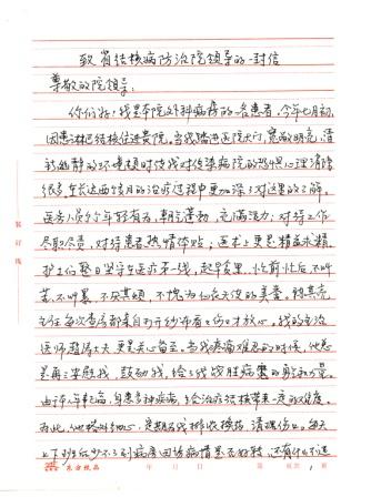 尊敬的领导: 你们好!我是本院外科病房的一名患者。今年七月初因患淋巴结核住进贵院。当我踏进医院大门,宽敞明亮、清新幽静的环境顿时使我对传染病院的恐惧心理消除很多,在长达两个多月的治疗过程中更加深了对这里的了解。医务人员个个年轻有为、朝气蓬勃、充满活力;对待工作尽职尽责,对待患者热情体贴;医术上更是精益求精。护士们整日坚守在医疗第一线,起早贪黑,忙前忙后,不叫苦不叫累,不厌其烦,不愧为白衣天使的美誉。陈其亮主任每次查房都亲自打开纱布看看伤口才放心。我的主治医师赵涛大夫,更是关心备至。当我疼痛难忍的时候,他总是再三安慰我,鼓励我,给了我战胜病魔的勇气和力量。由于本人年事已高,身患多种疾病,给治疗结核带来一定的难度。特此,他格外细心,定期为我排脓换药,清理伤口。每天上下班后少不了到病房回访病情是否好转,还有什么不适的地方……,这一番真诚问候,胜过一剂良药,他是我们患者的贴心人。目前我的病情已有了根本的好转,不久即将出院,我感谢院领导提供这样良好的医疗条件,营造这样一支医疗技术过硬的队伍。 在我们医院里,还有一个让人称赞的地方,就是我们医院的食堂。不仅饭菜花样多,味道也好。主副食竟多达二、三十种。除此之外,还开了小灶供大家自选。方便的像在家里一样。操作间干净整洁,就餐环境卫生均属一流。餐厅办的这么好,离不开好的带头人。郭师父以身作责,早起晚归,带头苦干,并经常深入就餐者中征求意见,千方百计提高饭菜质量,花样品种不断翻新,努力降低成本,严把卫生关,加强管理,严格要求。整个炊事班有条不紊,厨艺精湛,服务热情,获得大家一致好评。办得这么好的食堂,在医院里我是第一次见到,市上没有一家医院可与之相比。我给他们送了一面锦旗, “饭美菜美心更美,味浓香浓情更浓”表达我的心意。建议有关部门认真加以总结推广,大力支持。“医院治病,食堂养身”二者密不可分。希望我们的食堂越办越好。 各位院领导:我写这封信的目的主要是为了与你们一同分享一个患者的亲身感受。职工中之所以能涌现出那么多好人好事,得益于领导们平时深入细致的思想工作和正确的指导。我把表彰先进、弘扬正气、提升正能量看作医患双方的共同责任。愿把我院办成医术进步,思想先进、设备一流的结核病防治院,为人民的健康作出新的贡献。不妥之处,请指正。祝各领导工作顺利,身体健康! 此致 患者及家属:陕西省对外贸易学校退休干部 任少林 陈素存 2013年9月10日