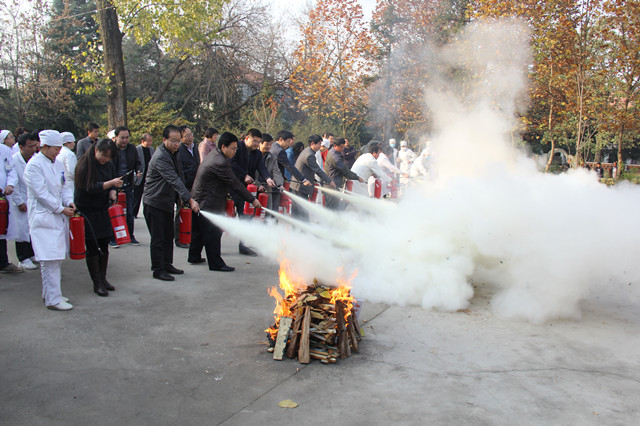 随着刘锦程院长一声令下,消防演习正式开始,模拟的四堆易燃物被点燃,院领导班子成员带头使用灭火器对可燃物进行灭火,随后参加演习的人员分组进行灭火演习,力求使到场的每位职工都能掌握灭火器的使用方法。到此,消防知识培训和实战演练取得圆满成功。