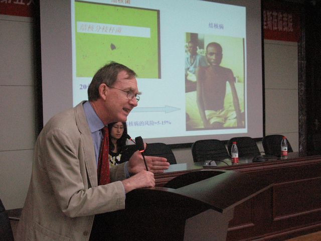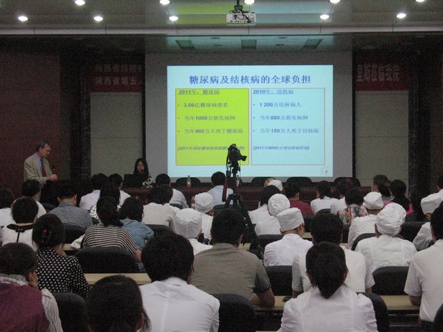 未来数年内,可能出现以耐药菌为主的结核病流行态势,结核菌与艾滋病病毒双重感染人数可能增加,结核病与糖尿病合并感染也存在增多的趋势,结核病防治面临着诸多新的问题与挑战。为掌握最前沿的结核病医学知识,提高医院学术氛围,我院于5月21日邀请国际防痨和肺部疾病联合会高级顾问安东尼·哈里斯先生莅临我院进行《糖尿病与结核病现状及对结核病控制的影响》学术讲座,讲座由副院长牛国强主持并致欢迎词,院长刘锦程及全院医、护、技人员约130余人参加听讲。 学术会上,安东尼•哈里斯先生从六个方面进行了详细介绍:一是糖尿病及结核病的全球分布情况;二是糖尿病及结核病的全球负担;三是未确诊病例[2011年有3.66 亿糖尿病患者,其中1.83 亿 (50%)未确诊;2010年有880万结核病患者,其中 310万(35%)未确诊];四是全世界糖尿病患者增加情况:2011年统计约有3.66亿糖尿病患者,到2030年将增加到5.52亿;五是导致患活动性结核病的风险(艾滋病毒感染/艾滋病、导致免疫抑制的因素(类固醇)、硅肺病、营养不良、室内空气污染、吸烟、酗酒、糖尿病)增加;六是不同学者观察性研究的系统综述,最终得出结果是:糖尿病增加了患结核病的风险[队列研究=RR 3.1,病例对照研究=OR 1.2-7.8];年轻人和生活在结核病高发地区的人患糖尿病的风险增加。 整个讲座通俗易懂、幽默风趣,会场里学习气氛浓厚。并进行了学术互动,安东尼·哈里斯先生耐心细致的解答了我院医务人员提出的问题,赞许我院医务人员丰富的临床工作经验,表示非常乐意与我院开展技术交流与合作,为我院结核病合并糖尿病研究人员的培养搭建更高的平台。 安东尼·哈里斯先生在我院的学术讲座属首次在中国结核病临床治疗单位进行的学术讲座。本次讲座为我们提供了最前沿的结核病新动向,开拓了我们在结核病防治方面的视野,带来了不少新的思考和感悟,是一次难得的学习机会,对我院拓展国际间学术交流,了解掌握最前沿的结核病医学知识,强化医疗服务工作,明确学科建设发展方向,提升医院外在形象具有积极的意义。
