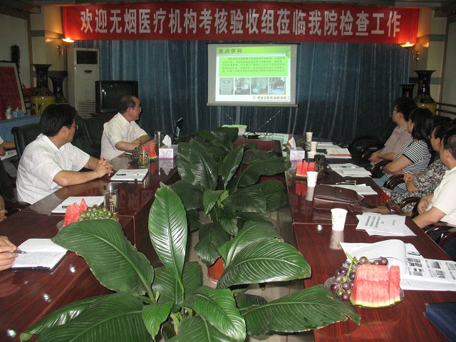 8月18日,陕西省卫生厅“创建无烟医院”工作组一行5人抵达我院,对我院创建无烟医院进行了考核验收,在刘锦程院长、牛国强、郭皖营、高彦斌副院长的陪同下,全院各科室医护人员迎接了考核验收。 工作组首先听取了我院关于无烟医院创建工作的报告。自今年3月我院就积极投入“无烟医院”创建工作,通过一系列举措将控烟工作落到实处。医院成立了控烟领导小组,实行院科二级管理,科主任与院长签订了控烟责任书,全院动员,层层落实;完善了控烟制度与措施,奖罚分明,表彰先进,对戒烟成功者进行奖励;确定控烟督导员和巡查员进行日常管理和监督;利用网站、宣传栏、宣传单等载体进行控烟宣传;发动医务人员戒烟、控烟,将控烟工作纳入日常诊疗活动中,切实发挥医务人员控烟的人群示范和社会影响作用。经过几个月的控烟工作实施,有十几位医务人员主动戒烟,院内患者吸烟现象明显减少,医院实现了室内全面控烟。 汇报会后,考核工作组严格按照卫生部《无烟医疗卫生机构考核评估标准》,分成资料组和现场组对医院控烟工作进行了评估检查。资料组详细查看了我院控烟各项规章制度、控烟监督员巡查员等各类人员的职责、医院各类人员控烟知识培训情况、控烟知识宣教、控烟奖惩制度及落实情况,并进行了详细评估。现场组对医院的禁烟标识、宣传展板、健康教育栏、室外吸烟区设置、门诊病人等候区、戒烟门诊、手术室病人家属等候区等重点场所进行实地检查评估。 考核验收组对我院职工在创建无烟医院活动中所作的工作及措施,做出了高度评价,并给予了肯定。