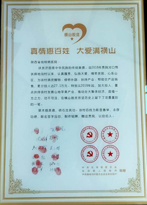 5月15日,榆林市横山区石湾镇曹书记、贺镇长代表镇党委、政府亲手将横山脱贫的铭牌亲手送到甘昭平书记手中,表达对医院多年精准帮扶的谢意。真情惠百姓,大爱满横山。自2016年来,我院对口帮扶麻地沟村以来,认真履责,为该村捐资赠物,修桥补路,扶持产业,帮助农产品销售,并重点扶持该村发展山地苹果产业,推动壮大集体经济,让当地人钱袋子鼓起来,腰杆子直起来,笑容多起来,让当地百姓真正感受到了党和政府精准脱贫的决心和大爱,感受的医院的真情和实意,为此,榆林市横山区石湾镇党委政府、麻地沟村委会和贫困户联名制作了对口帮扶脱贫铭牌,赠送给医院,表达他们满心的谢意。