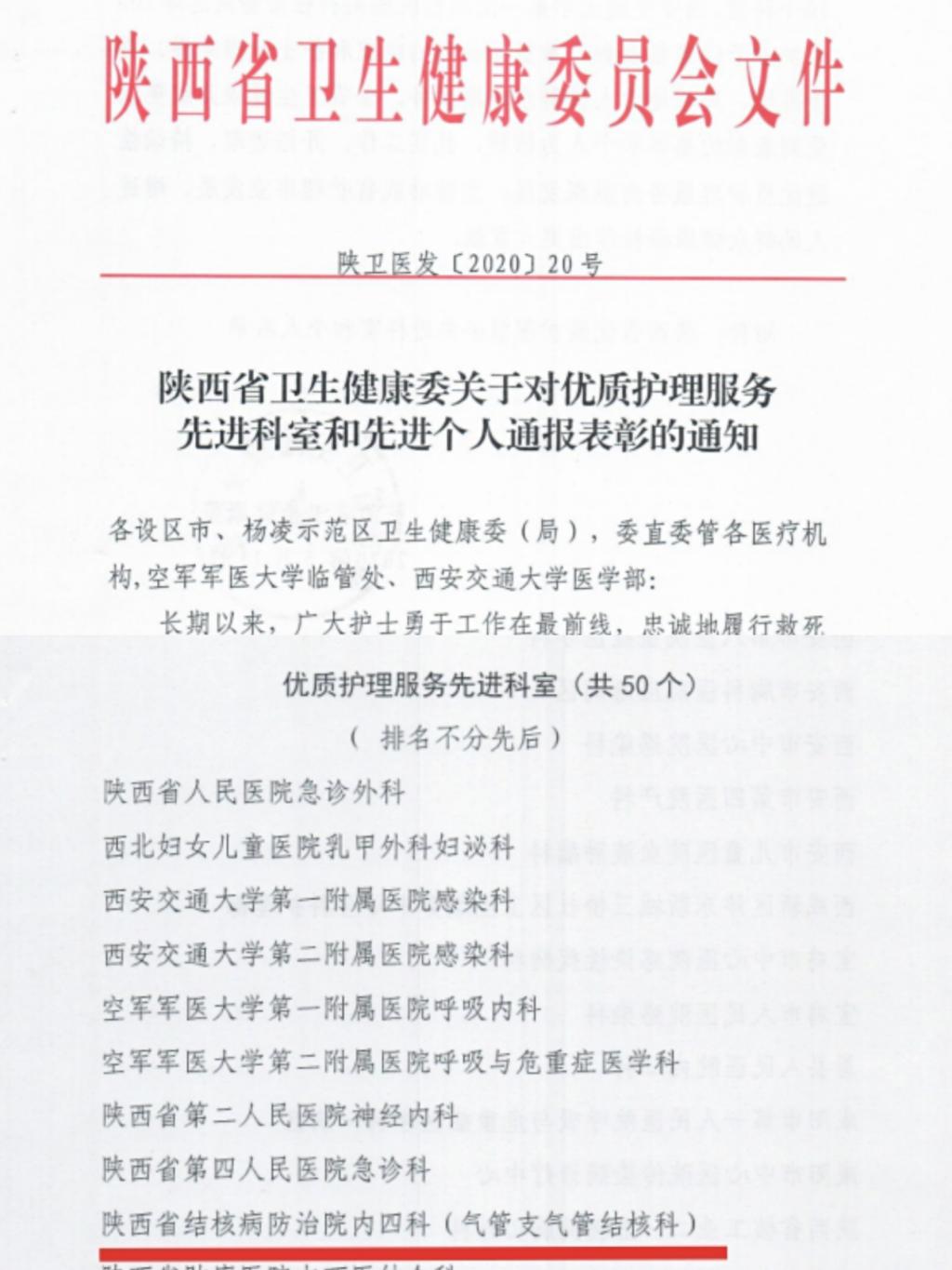 近日,陕西省卫健委下发关于对优质护理服务先进科室通报表彰的通知,对在护理服务工作中表现突出的全省50个科室,予以通报表彰,我院支气管结核专科名列其中。