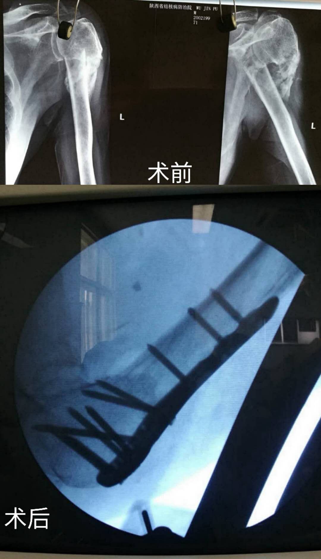 患者吴某某,男性,72岁,因3月前车祸导致全身多处骨折,在外院行右侧股骨转子间PFN固定术,右侧胫腓骨外固定手术治疗,因合并肺结核,身体状况差,左侧肱骨外科颈骨折复杂,辗转多家综合医院无人收治,后在我院抗结核治疗,身体状况支持稳定后,经过综合外科,手麻科组织术前MDT讨论,制定详细手术计划,并于今日进行手术。术中仔细解剖,严密止血,松解周围纤维骨痂及增生肉芽组织,修整骨折端,充分游离周围黏连,牵引复合对位良好,选用适合长度锁定钢板固定,C型臂透视证实对位、力线良好,固定牢固,手术顺利完成。该例手术系我院综合外科成立后首例关节切复内固定手术,意味着医院在骨外科患者救治领域达到一定水平,必将更好地满足广大骨外科患者的就医需求。