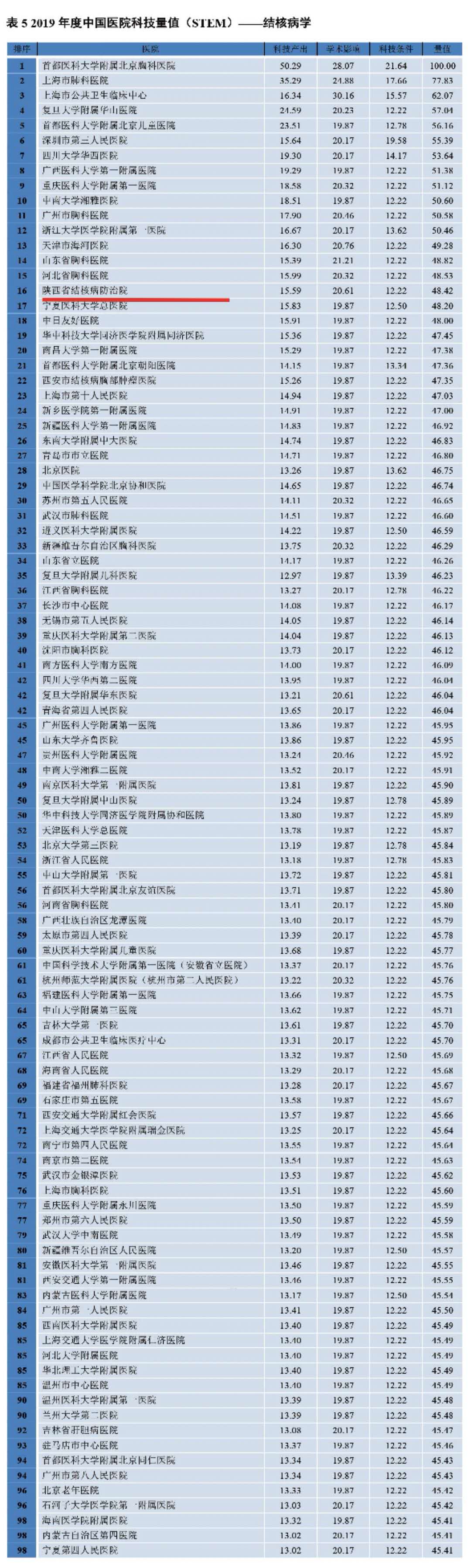 8月21日,2019年度中国医院科技量值报告在京发布,在结核病学专业涉及全国98家大型医院中,我院排名第16位,陕西排名第一。相比2018年全国排名29名,名次大幅提升。