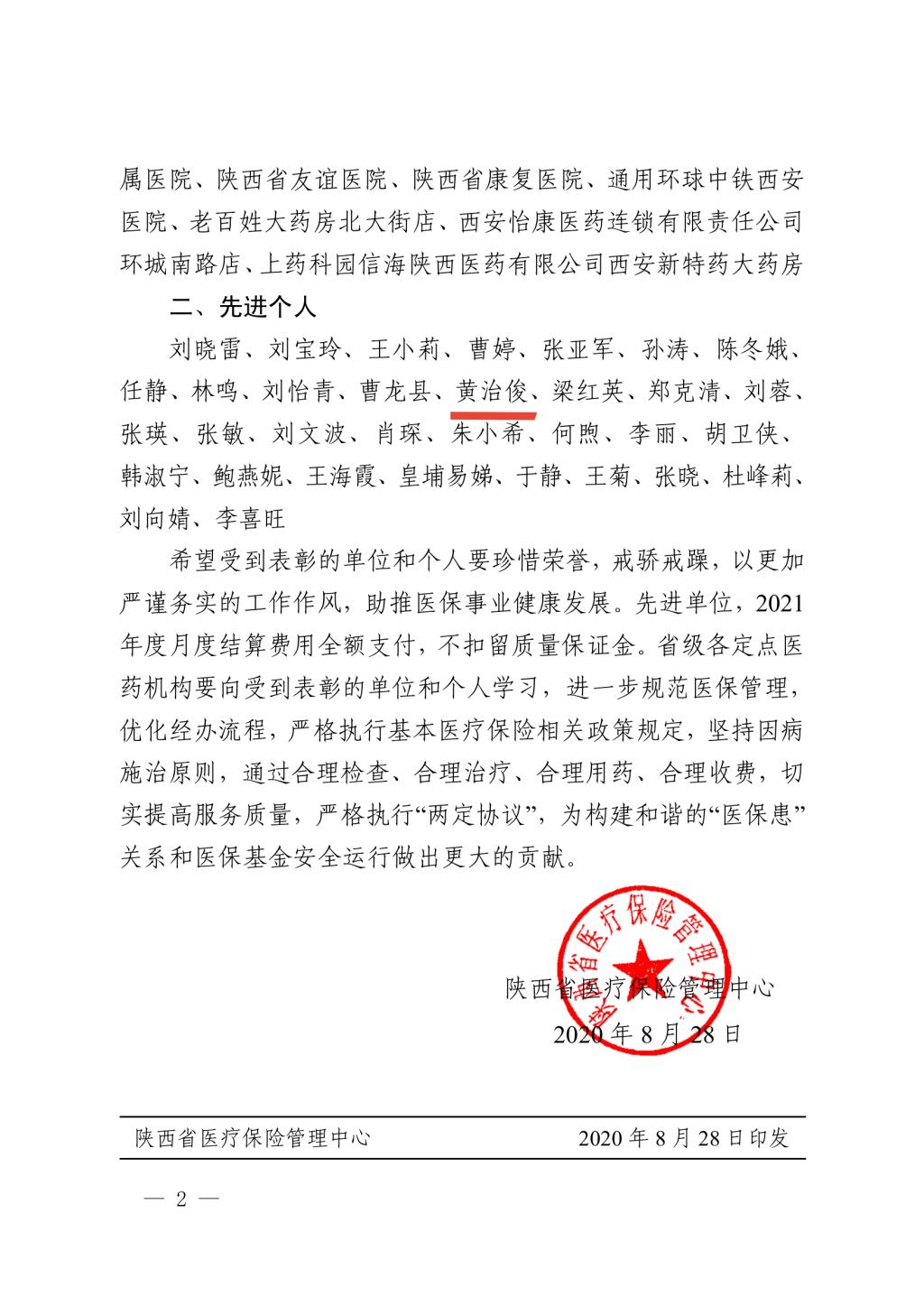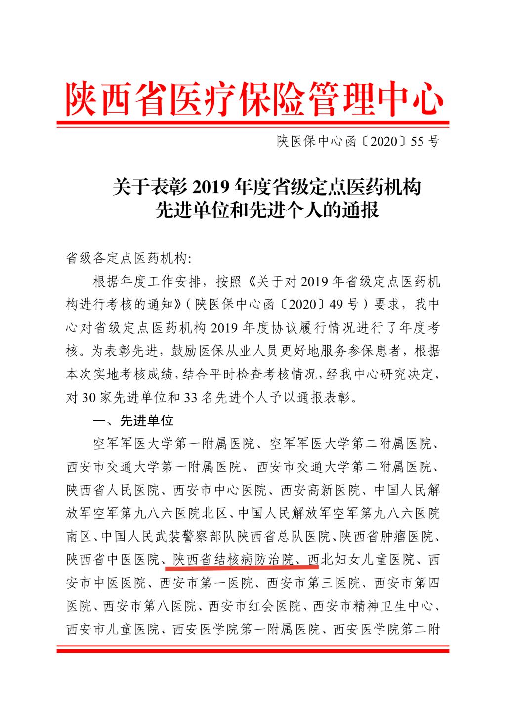 近日,陕西省医疗保险管理中心公布省级定点医药机构2019年度协议履行情况年度考核结果,我院等30家机构获评先进单位,我院医保科科长黄治俊获评先进个人。
