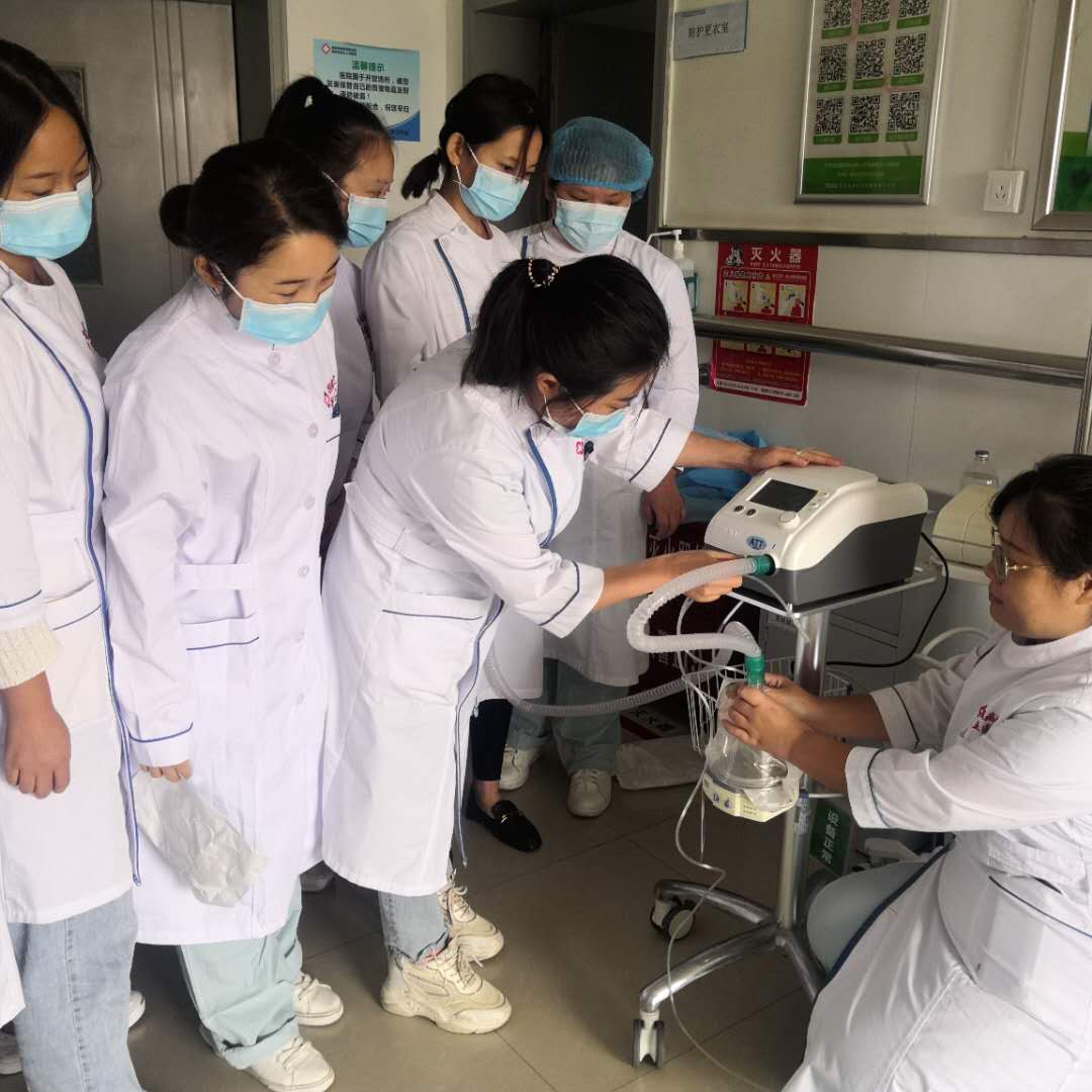 上午,大家对半年来发热隔离病人管理治疗经验进行发言讨论,分享心得,国福云主任带领大家学习第八版新冠防治指南,杨薇护士长带领护士学习危重症新冠患者护理要点,新冠疑似患者接诊应急预案、危重症患者抢救预案、患者人数突然增加的应急预案以及护理人员心理护理等。下午,护士长杨薇带领护士们反复熟练无创呼吸机、高流量吸氧机、除颤仪、简易呼吸气囊等仪器的使用流程及注意事项、故障处理,同时反复熟练急救箱药品使用方法,要求每位护士5秒之内取出所需药品及注射器,确保高效率高质量完成工作。