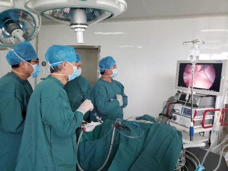 患者刘某主因右上腹反复间断绞痛10天,发现肺部阴影2天。因反复右上腹绞痛在当地县医院诊断为急性结石性化脓性胆囊炎,术前检查发现肺部阴影,疑诊肺结核,所以来我院求医。入院后给予规范抗结核治疗一月,肺部病灶稳定。但胆囊病灶带来的剧痛难忍。为了解除患者的病痛,我院综合外科特邀陕西省人民医院肝胆外科主任杜立学教授协作,为患者实施全麻下腹腔镜胆囊切除术,术中发现患者胆囊处于急性水肿期,胆囊壁增厚、硬化严重,与大网膜,胃肠黏连紧密,胆囊三角及胆总管,胆囊管、肝总管解剖结构不清,属于非常棘手的困难胆囊,切除难度非常高,一旦操作不当,就会伤及其它脏器。专家们技术高超,心细如发,仔细松解黏连组织,显露胆囊管肝总管及胆囊三角,历经近3个小时的连续手术,最终顺利为患者切除胆囊。
