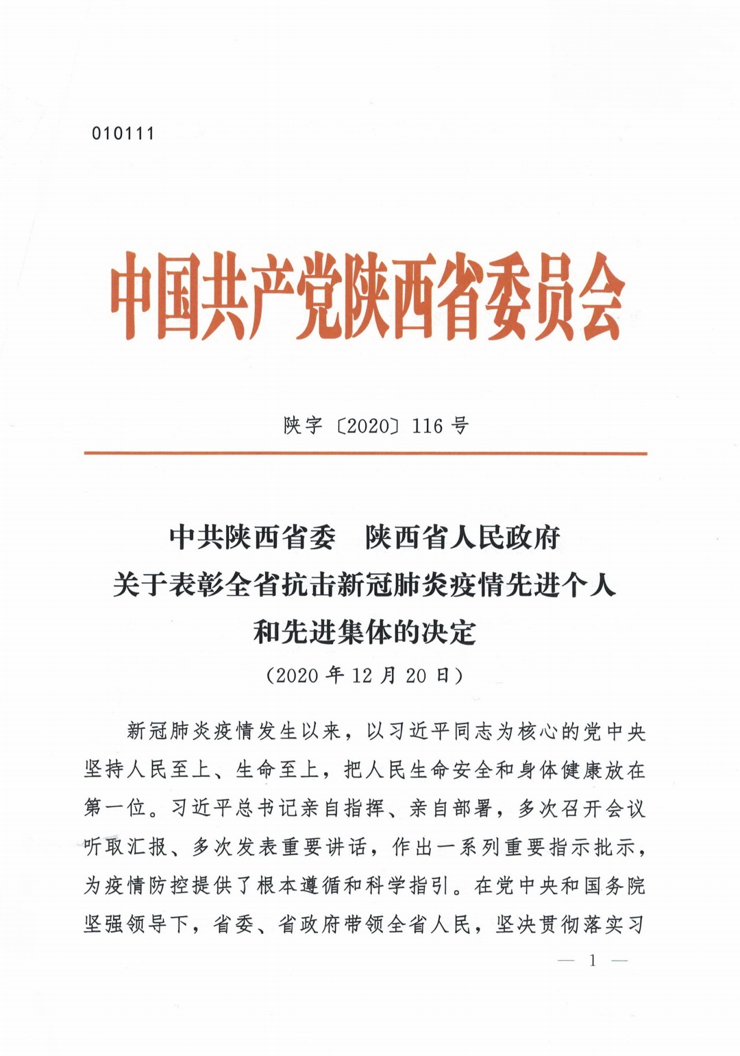 在庆祝中国共产党成立100周年之际,为大力弘扬“生命至上、举国同心、舍生忘死、尊重科学、命运与共”的伟大抗疫精神,陕西省委、省政府对全省在抗击新冠肺炎疫情工作中表现突出、成绩显著、事迹感人的优秀共产党员、先进个人、先进集体给予表彰,我院刘红艳同志被授予“陕西省抗击新冠肺炎疫情先进个人”荣誉称号。