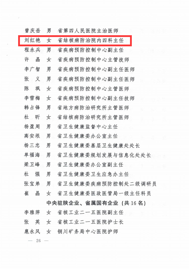 刘红艳,陕西省结核病防治院支气管结核科主任、主任医师,陕西省首批援鄂医疗队第五小组组长。曾获得西安市“最美医师”、第二届“全国最美防痨人”“三秦最美医务工作者”“陕西省三八红旗手”等荣誉称号。