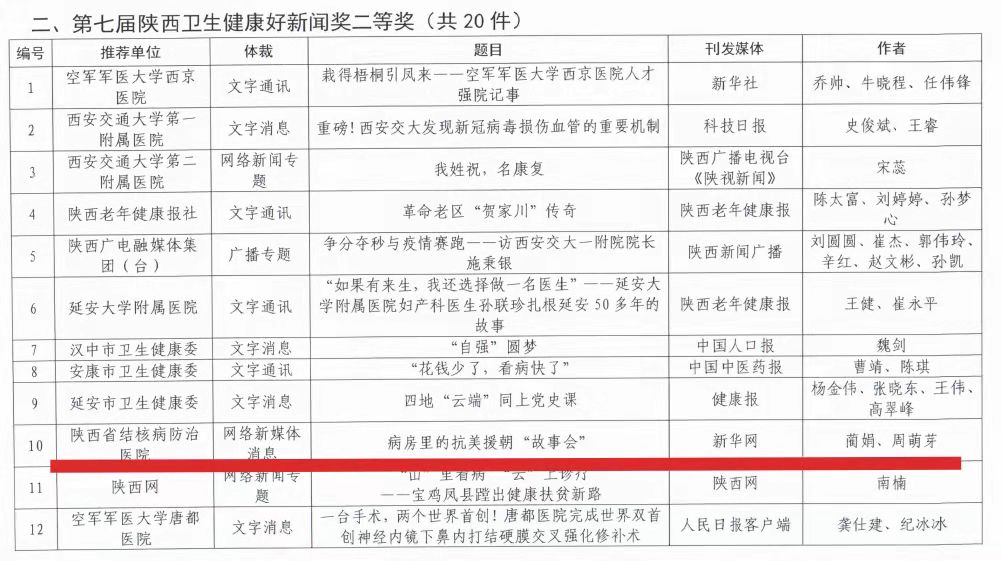 陕西卫生健康好新闻奖系列奖评选是由陕西省卫健委在全系统组织并开展的一项重要评选活动,旨在不断提高卫生健康系统新闻宣传工作传播力、引导力、影响力、公信力,持续营造卫生发展良好舆论环境,今年8月,“第七届陕西卫生健康好新闻奖”评选活动开始面向全省征集优秀新闻作品,经组织专家审核、初评、定评,最终评选出一、二、三等奖各10件、20件、30件。我院报送的网络新媒体消息《病房里的抗美援朝故事会》选题独特、主题突出,在220件参评作品中脱颖而出,与空军军医大学西京医院、西安交大一附院、陕西广电融媒体集团、西安市卫健委、汉中市卫健委等单位同时获得二等奖。