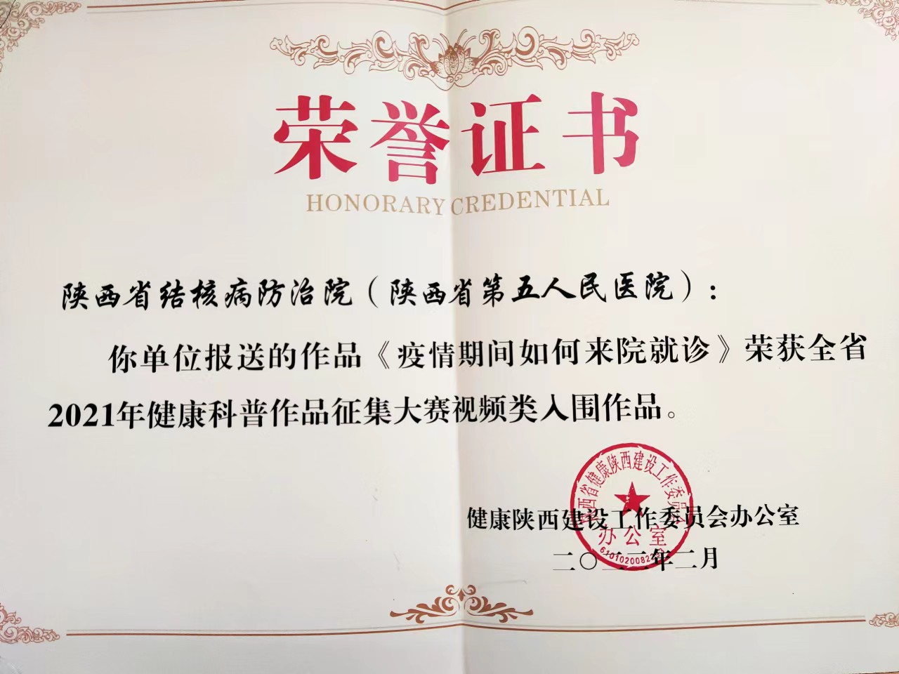 近日,陕西省健康陕西建设工作委员会办公室公布全省2021年健康科普作品征集大赛优秀及入围作品名单,我院内三科护士长刘晓荣制作的《呼吸保健操》和中西医结核科护士长张娜制作的《疫情期间如何来院就诊》荣获2021年健康科普作品征集大赛视频类类入围作品,并将和其它获奖作品一起纳入陕西省健康科普资料,供全省下载使用。