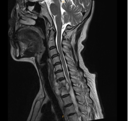 该女性患者,以“右侧肩背部疼痛双上肢麻木半年” 伴吞咽困难主诉入院。入院MRI检查可见“颈7胸1椎体骨质破坏,椎管受压”。科主任陈其亮主任医师组织科室讨论并仔细查看病人后认为:病变位于活动灵活前凸的颈椎和相对固定后凸的胸椎的交界处,更易导致后凸畸形或局部不稳定,其椎管相对较小,椎管壁与硬脊膜囊前方间隙较窄,椎管内脊髓缓冲空间小,当结核病灶侵及硬膜外、压迫硬膜囊时,容易导致截瘫。由于患者已经出现明显神经受压症状,为避免出现截瘫等严重并发症应行手术解除压迫,由于颈胸段椎体部位深,前路手术前方有胸骨、胸锁关节阻挡,病变椎体周围有众多大血管、喉返神经、胸导管和交感神经,显露均较为困难,综合病变特征认为虽然前路手术风险大,但可以彻底清除病灶,椎管减压效果更好,权衡利弊后经术前充分准备于近日在手麻科插管全麻配合下成功经低位颈前入路实施病灶清除、椎管减压及植骨内固定术,术后次日查房患者神经压迫症状明显缓解。