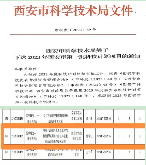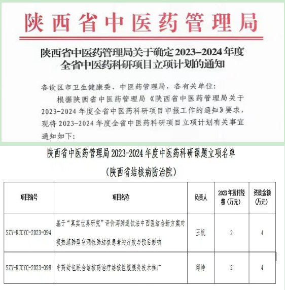 本次获得立项的三个项目为:仵倩红副院长科研团队申报的《等离子活化的生理盐水对结核性脓胸及肺外结核体表脓腔治疗效果的临床研究》,中西医结合科王帆医生申报的《基于“真实世界研究”评价泻肺逐饮法中西医结合新方案对痰热蕴肺型空洞性肺结核患者的疗效与预后影响》以及邱峥医生申报的《中药封包联合结核药治疗结核性腹膜炎技术推广》。三个项目总资助经费为11万元。
