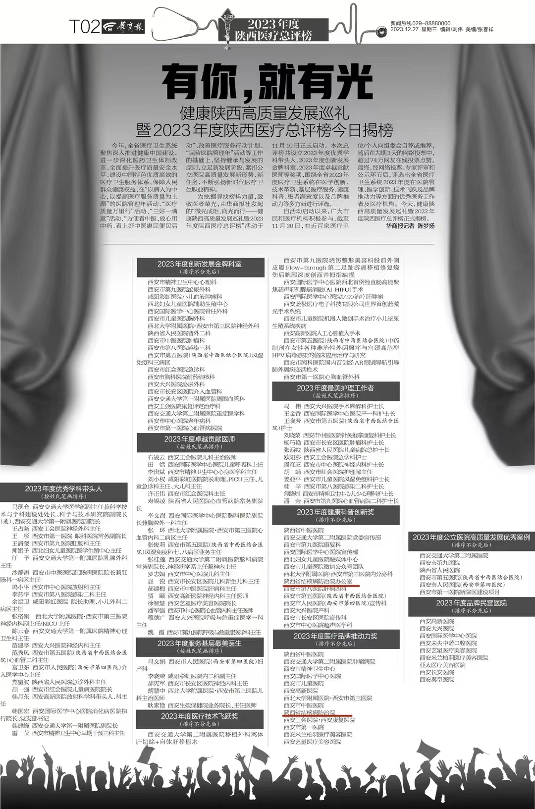 12月27日,由《华商报》社主办的健康陕西高质量发展巡礼暨2023年度陕西医疗总评榜揭榜,我院喜获2023年度医疗品牌推动力奖及2023年度健康科普创新奖。