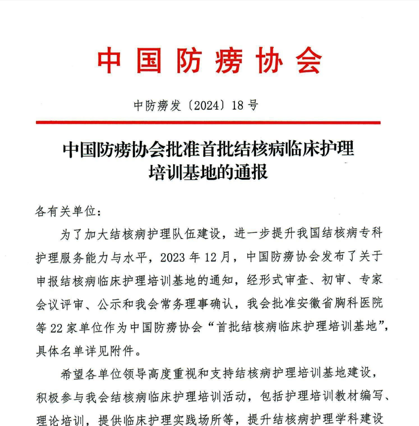 为了进一步提升我国结核病专科护理服务能力与水平,2023年12月5日,中国防痨协会发布了《关于结核病临床护理培训基地的通知》,我院护理部积极组织申报,此次申报得到院领导高度重视、大力支持,经提交书面材料审核、参加答辩评审会议,我院最终顺利获批“首批结核病临床护理培训基地”。