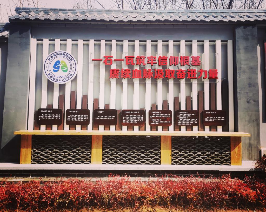 出乎史,入乎道。欲知大道,必先为史。2023年底,随着历时三年的陕西省公共卫生中心(一期)项目顺利建成,院容院貌焕然一新。为纪念建院60余载不平凡的历程,汲取弘扬历代结防人“艰苦奋斗、自力更生”的精神传承,持续巩固拓展学习贯彻习近平新时代中国特色社会主义思想主题教育成果,始终把党的政治建设摆在首位,恪守医德医风医道,努力为人民群众提供更加贴心高效的健康服务,进一步筑牢全院同志艰苦奋斗、和谐进取、锐意不怠的精神风貌,院党委决定以五十年代用河滩石为原料建设的东围墙为依托,打造一处纪念老一辈结防人肩挑背扛、砌石成墙的艰苦创业历史,汲取历代结防人春满杏林、医者仁心的岐黄纪念高地。并以“一石一瓦筑牢信仰根基,赓续血脉汲取奋进力量”为主题,建设院史文化墙,并由总务科负责这一文化工程、精神高地的设计建设工作,院办公室配合提供文化墙文字内容的撰写及历史照片的收集整理。