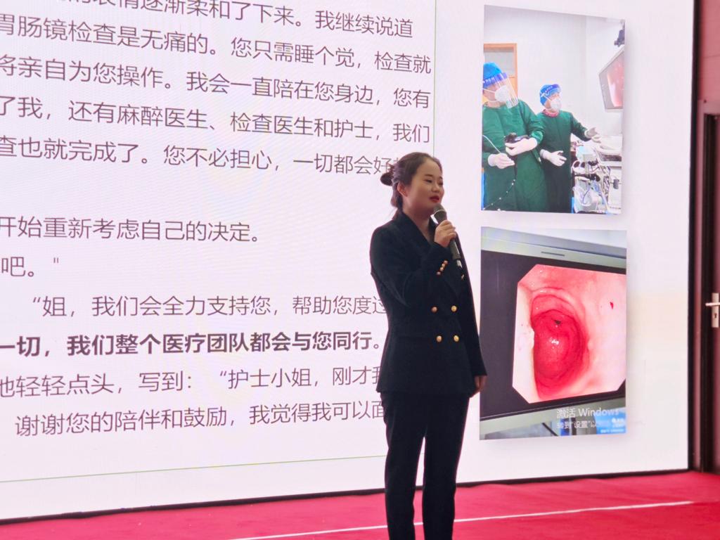 有时去治愈,常常去帮助,总是去安慰。本次参赛作品素材均来源实际临床工作,内容朴实感人,形式丰富多样,充分展现了我院护理人员细致入微的人文情怀。决赛现场,选手们配以音乐、图片、视频资料,通过情景剧表演、现场叙说等形式,讲述了他们与患者之间的温情故事,真挚的话语、炙热的情感,对生命的敬畏与尊重,对职业的热爱与坚守,打动了在场所有人员。评委们从主题、形式、内容、表演效果等方面进行综合评估打分。最终经过激烈的角逐,综合内科王妍的作品《一灯如豆,映光千里》因为生动感人、情感饱满摘得桂冠,门诊部王洁琼讲述的的《医患情深 温情相存》、内四科刘萌和杨金娜演绎的《用心倾听 温暖病人的心灵港湾》获得二等奖,内六科护理团队演绎的《生命里的一道光》、结核外科蔡亚梅的《用心聆听,用爱共情》以及内二科赵婉婷的作品《生命的光是爱》获三等奖。