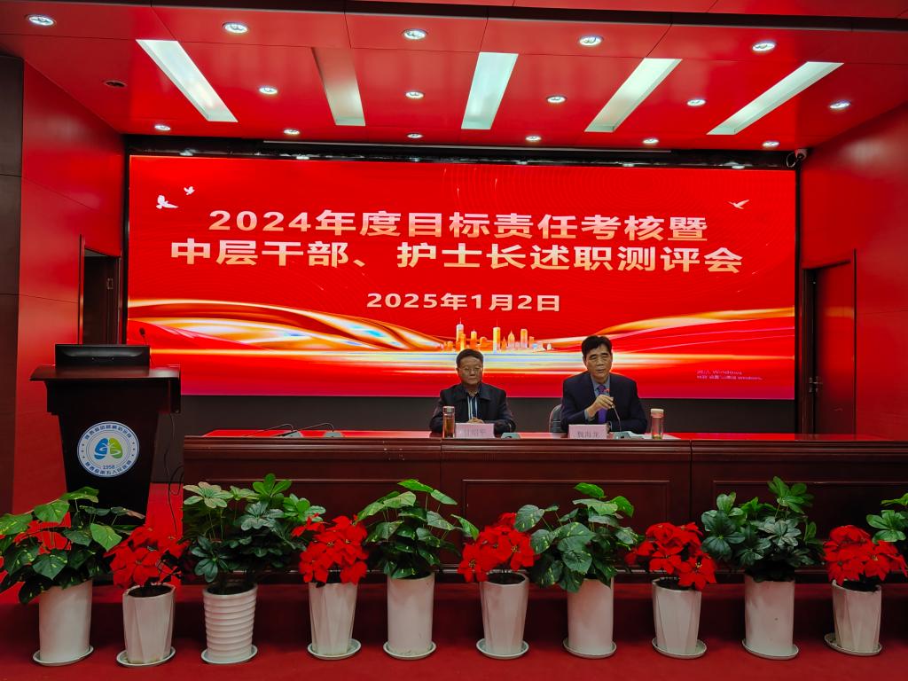 岁序更替,华章又新。为全面总结医院过去一年的工作,展示各科室的业绩亮点、问题短板,谋准谋实新年度发展大计,2025年1月2日,我院召开2024年度院内目标责任暨中层干部述职测评大会,会议由王海明副书记主持,院领导班子成员、中层干部、护士长、高级职称人员参会。