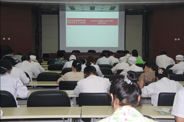 为了贯彻落实2014年全省卫生计生系统纪检监察工作电视电话会议及中共陕西省卫计委党组《关于进一步加强党员领导干部廉洁从政教育培训工作的意见》精神。按照院党委安排部署,于8月14日下午,组织我院部分公职人员对省纪委驻省卫生计生委纪检组编印并下发的《公职人员廉洁自律手册》知识学习的情况进行了集中考试。参加考试人员的名单采取多部门用抽号软件随机抽取的方式确定,通过单人单桌、开卷考试的方式进行,考试期间甘昭平书记带队与其他在院领导到考试现场进行了巡考。