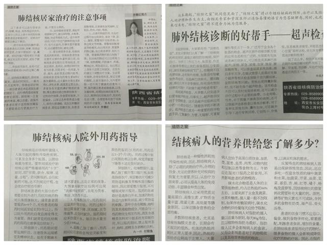 全球结核病的现状以及对结核病的认识程度和政府对结核病治疗的管理形势,让人们充分认识到结核病的防治是一项长期而艰巨的工作。作为陕西省三级甲等结核病防治专科医院,院领导非常重视科普宣传工作,成立了科普知识宣讲团,定期在新闻媒体、报刊、网络等平台进行科普知识宣传。我院在普及大众结核病防治知识方面发挥重要作用,为了更好地做好全省结核病的宣教工作,2018年12月28日我院在《社会保障报》就《社会保障报》“健康养生”版建立“结核之窗”栏目。