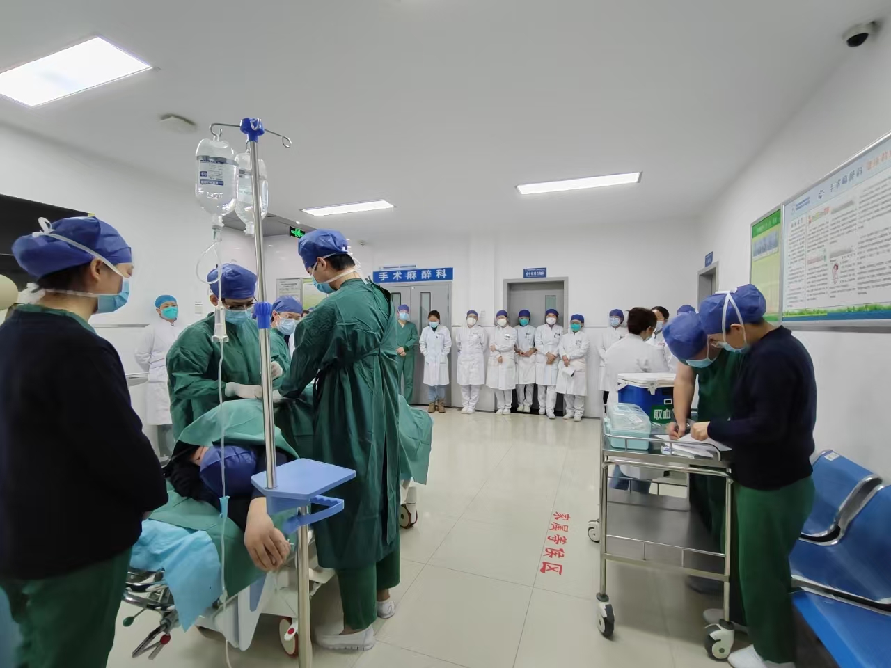 术后活动性出血是手术中常见可能危及患者生命的并发症。手术室演练现场,一位患者行右侧结核性脓胸胸膜剥脱术,在手术缝皮后,清点器械时,患者血压突然降低,胸腔闭式引流瓶中短时间引流出大量鲜红色血性液体,考虑发生失血性休克,医护人员立刻展开皮肤消毒、手术探查、给药、备血、取血、输血、缝扎出血小动脉等一系列急救措施,整个过程紧张有序,医护人员配合紧密,患者生命体征逐渐平稳,被送往复苏室。