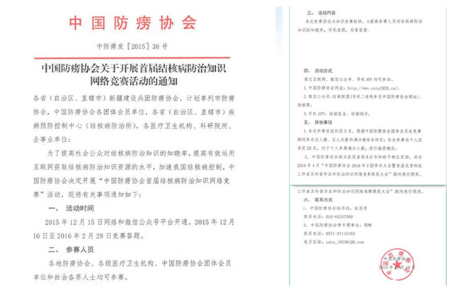 3、参加活动方式:互联网、微信公众号及手机APP,在中国防痨协会官网竞赛版/index.html、微信公众号“结核帮”以及手机APP“结核医生”和“结核助手”都可参与活动。