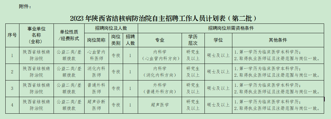 附件:《2023年陕西省结核病防治院自主招聘工作人员计划表》(第二批)