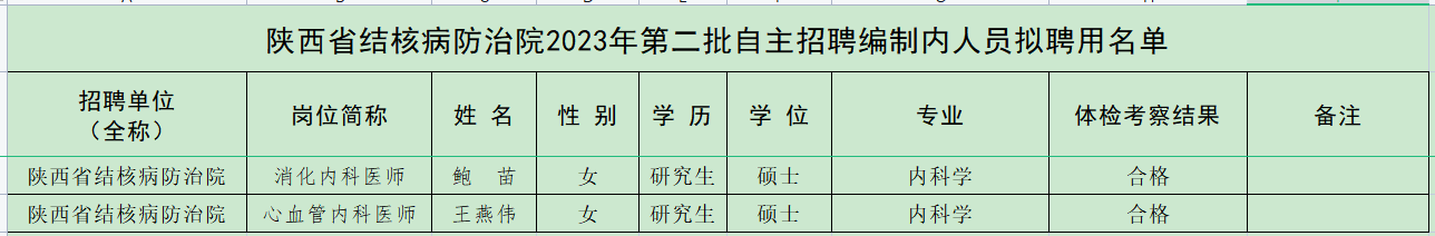 根据陕西省结核病防治院2023年第二批自主招聘编制内人员工作安排,经资格审查、笔试、面试、体检及考察等程序,确定鲍苗、王燕伟2人(详见附件)为陕西省结核病防治院拟聘用人员,现予以公示。如有异议,请向陕西省结核病防治院人事科反映。