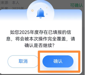5、弹出提示:如您2025年度存在已采集信息,将会被本次操作完全覆盖,请确认是否继续?点击“确认”。 |