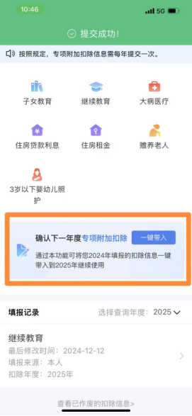 2、点击确认下一年度专项附加扣除“【一键带入】” |