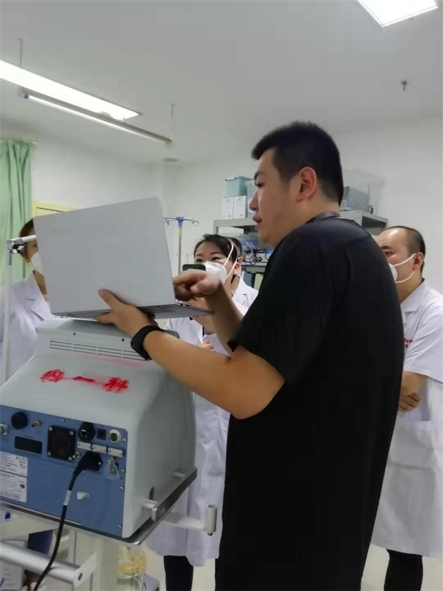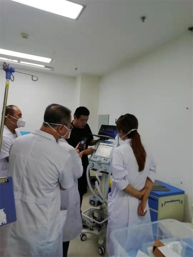 此次培训采取走进科室现场理论讲解及实物操作的形式。由呼吸机工程师陈林涛针对呼吸机工作原理、有创机械通气及无创机械通气的比较与注意事项、呼吸机操作步骤、呼吸机使用的适应症和禁忌症、参数的调节、常见报警原因及其处理方法、管路的消毒、机器维护等相关理论知识和实际操作进行了详细讲解。
