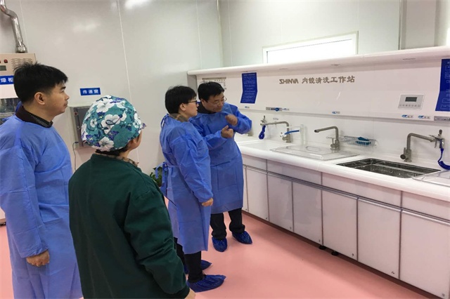 我院消毒供应中心在院领导和护理部及各个部门的辛苦努力下,搬迁已半年有余,在这半年来科室从刚开始搬迁后的不规范到现在工作逐步规范化,各区工作井然有序。全院所有器械已实行集中式规范化管理。通过外派专人学习,胸腔镜器械清洗、消毒、灭菌已经顺利开展。2018年12月18日,虽说是冬日,阳光灿烂,中科院生物物理所佛山分所所长、国家万人计划科技创新领军人才、首届全国科技创新争先奖获得者、国家重大专项TB疫苗研发首席、国家重点领域创新团队带头人毕利军教授及助理一行4人在我院授课结束后,由刘锦程院长和仵倩红副院长陪同参观了我院消毒供应中心。